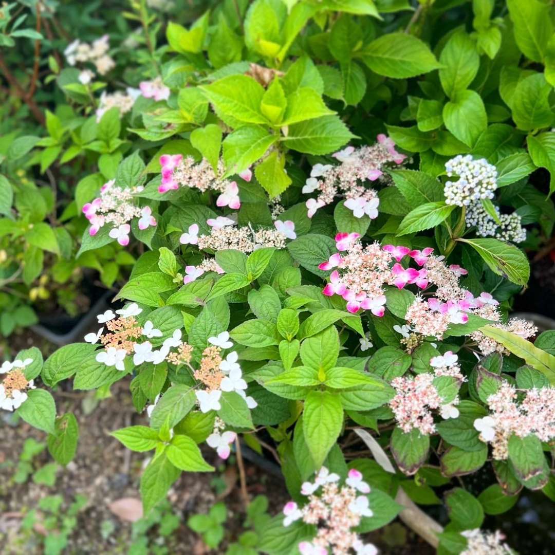 ツツジを眺めていたら、いつの間にか山アジサイ クレナイ が開花。