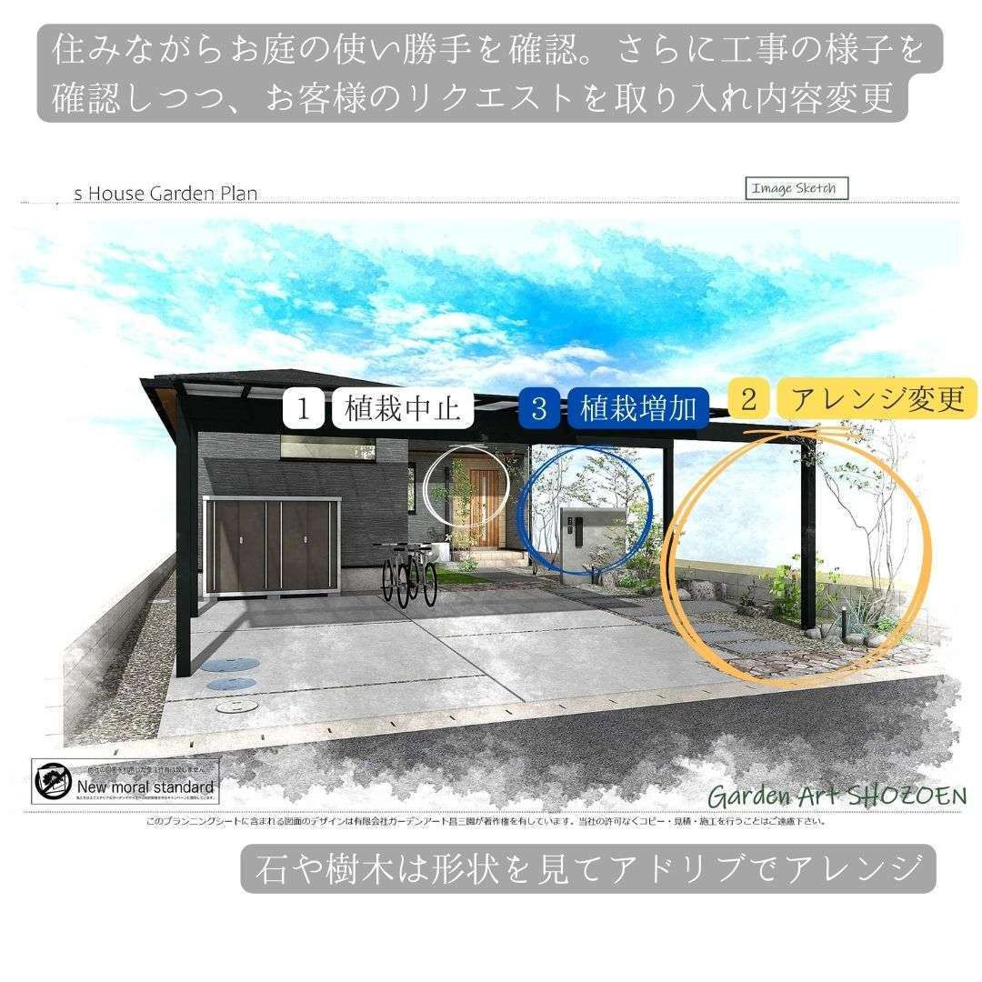 居住しながら工事の様子を見て頂いて、植栽予定箇所を一部中止したり、逆に窓と屋外の視線の関係から、植栽を増やしたりと施工が始まってから変更可能な箇所は施工時に変更します。