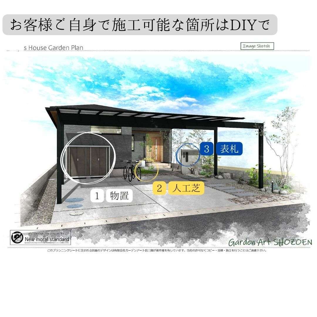 物置・人工芝・表札はご自身で選択・施工可能との事でしたので、プロの手が入らないと難しい箇所まで仕上げをしています。
