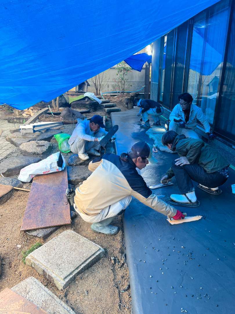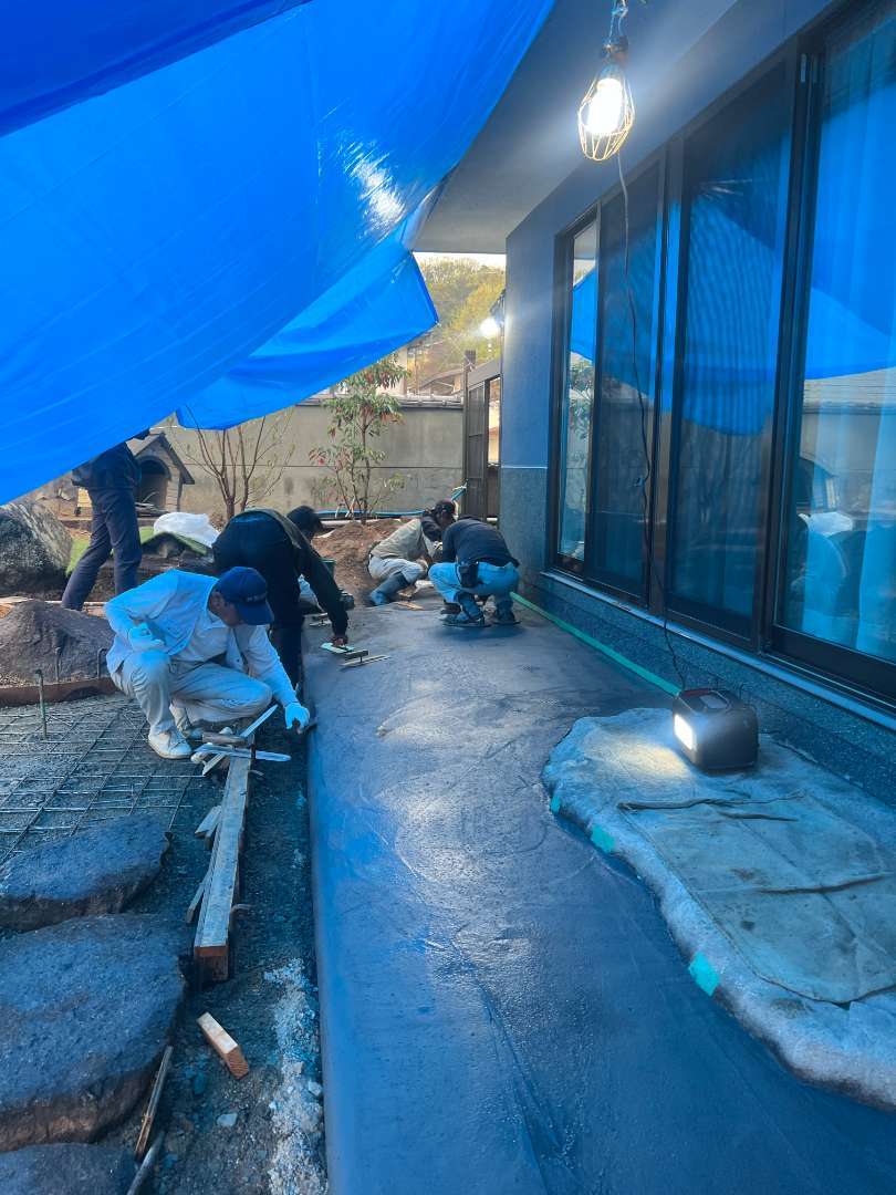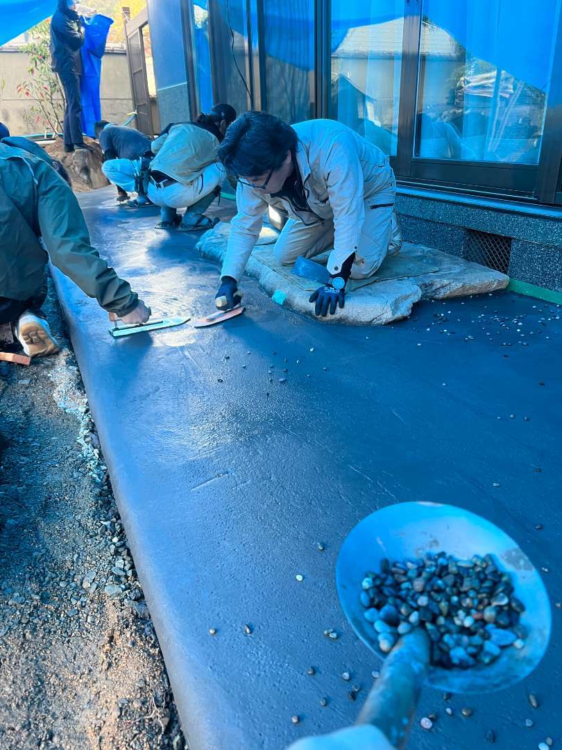 時間との勝負なので、ノンビリ砂利を撒いていたらどんどんコテ部隊が迫ってきます。