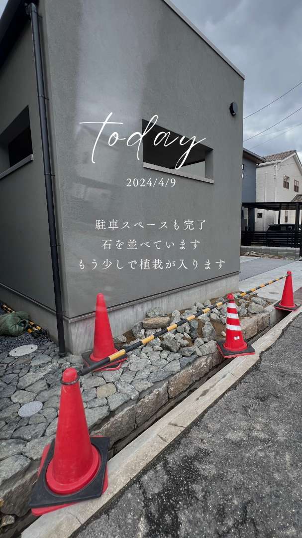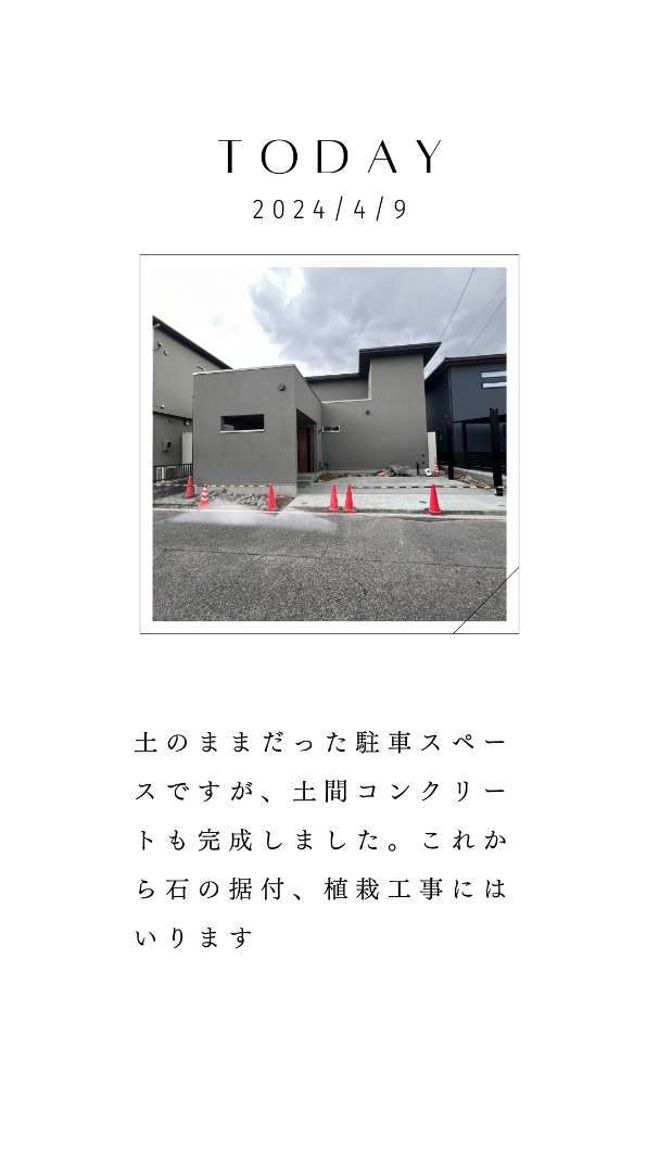土のままだった駐車スペースが土間コンクリート+洗い出しで出来上がりました。あとは植栽とSCカーポートの屋根設置を残すのみとなりました!