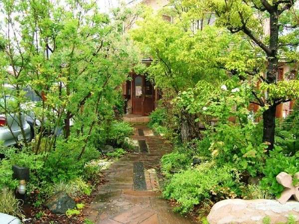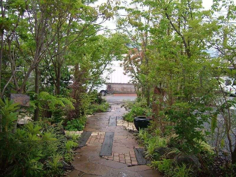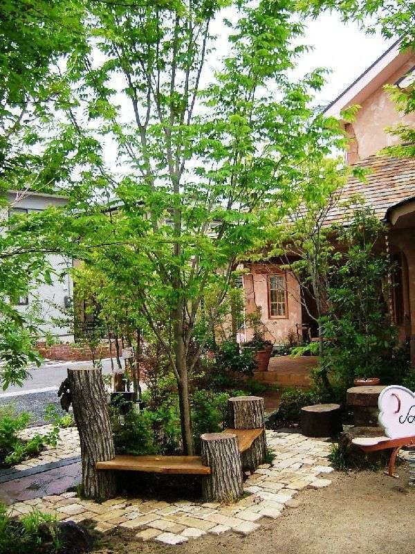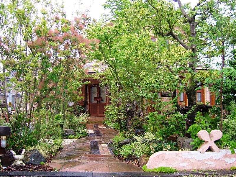 福山市駅家町にある「手創りケーキ工房エンジェル」さんのお庭です。オーナー様が森の奥にひっそりとあるお店というイメージをご希望でした。外構とアプローチは既に完成済み。