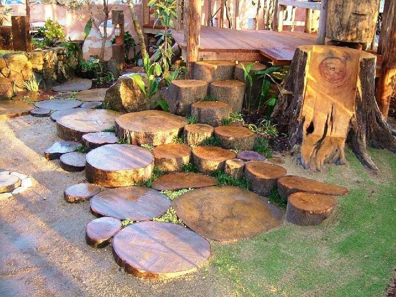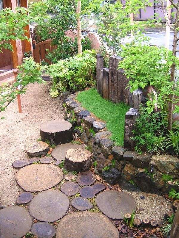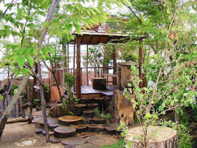 森の中の隠れ家がテーマですので、できる限り自然石・丸太・枕木などの自然素材を使いました。