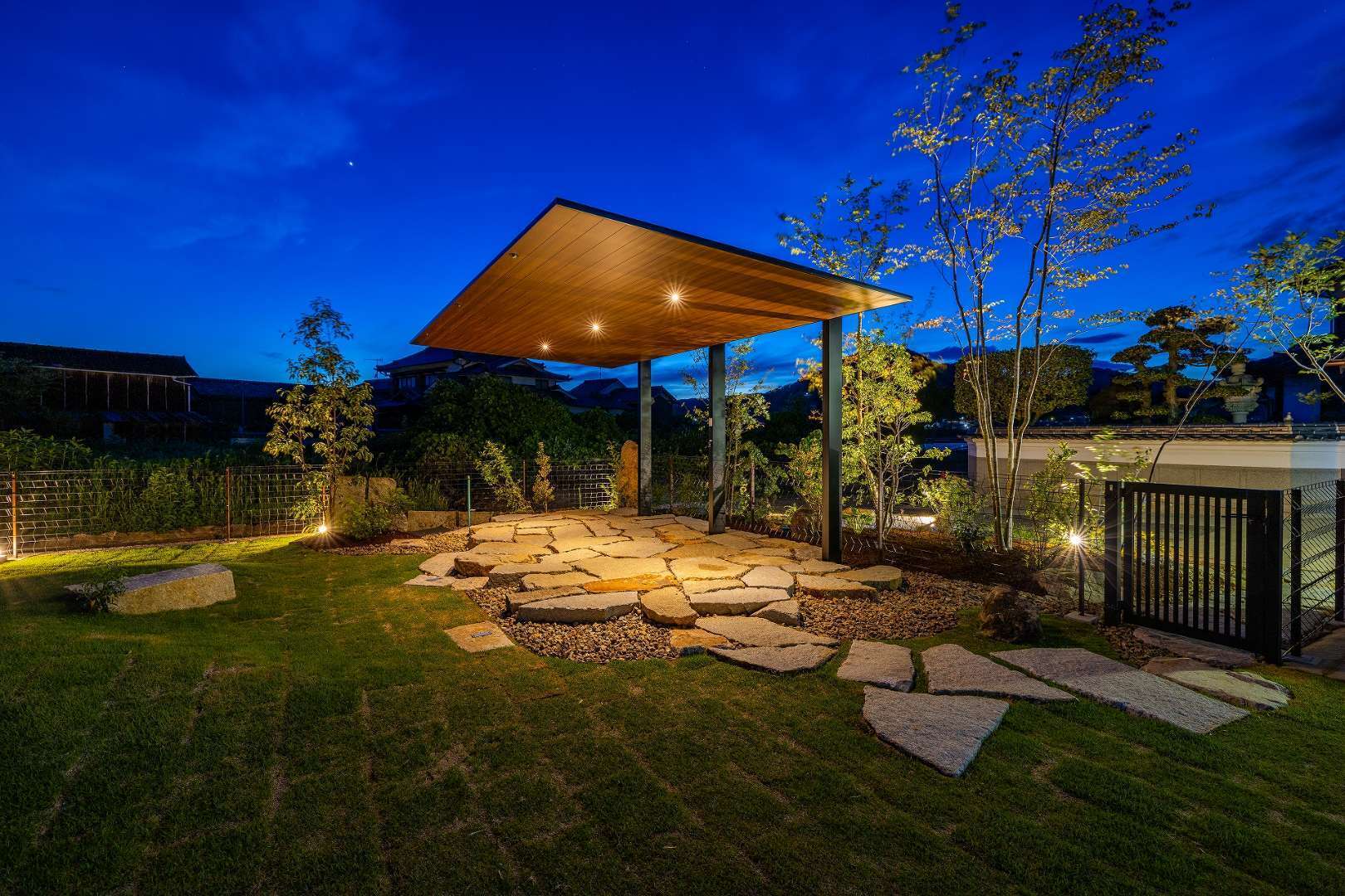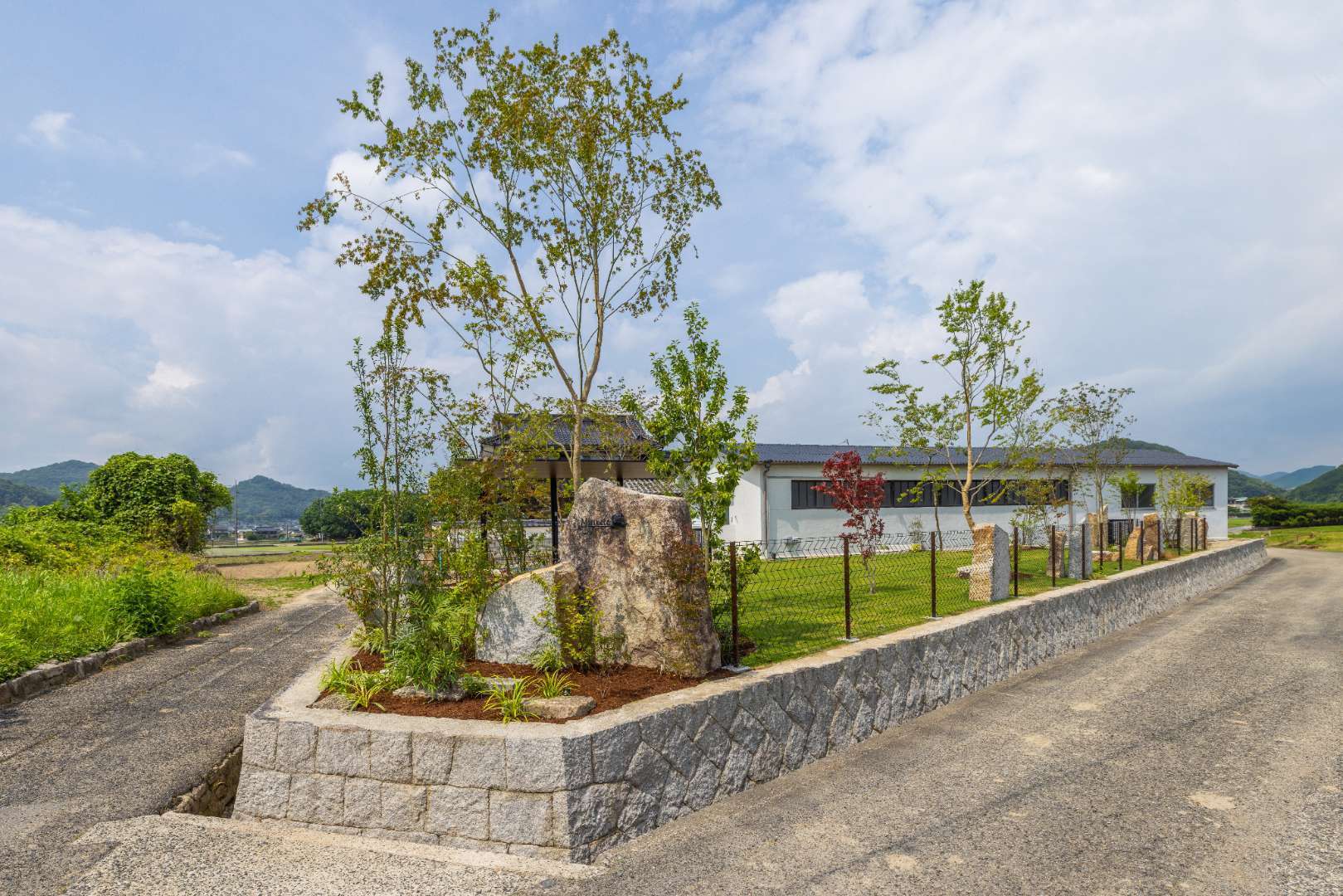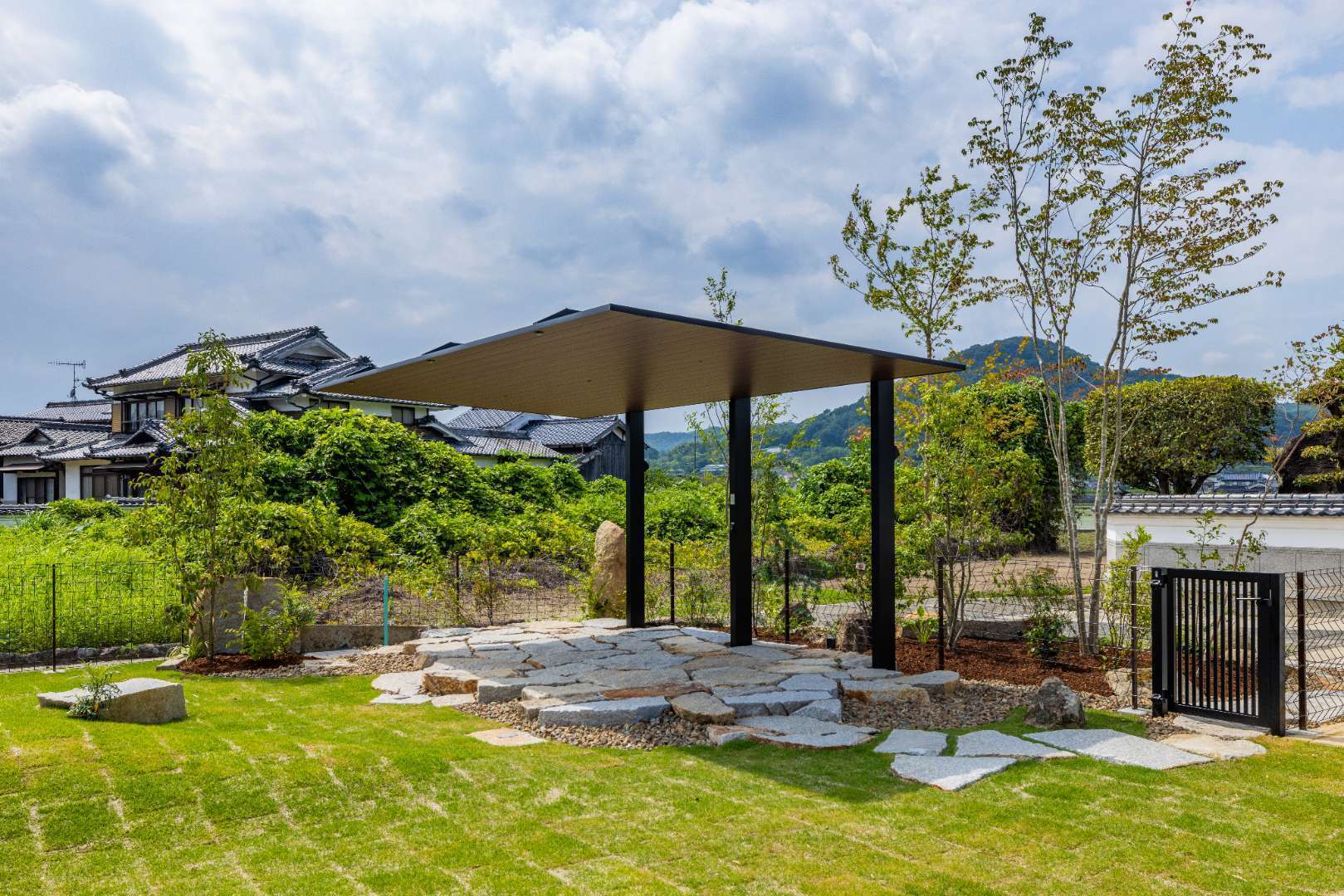 かつて畑として利用していた敷地をドッグランへと改修する事がご希望でした。ラン内に芝と植物と屋根付きテラスもご希望されており、照明も加えて昼夜問わず楽しめる空間デザインとしました。また、面積が広大なので周囲の風景を考慮して、地元の石材や敷地内の既存石も再利用し、SCカーポートの持つスタイリッシュな雰囲気と既存建物、地域の風景を融合させ、印象的なスペースとなる様に留意しました。