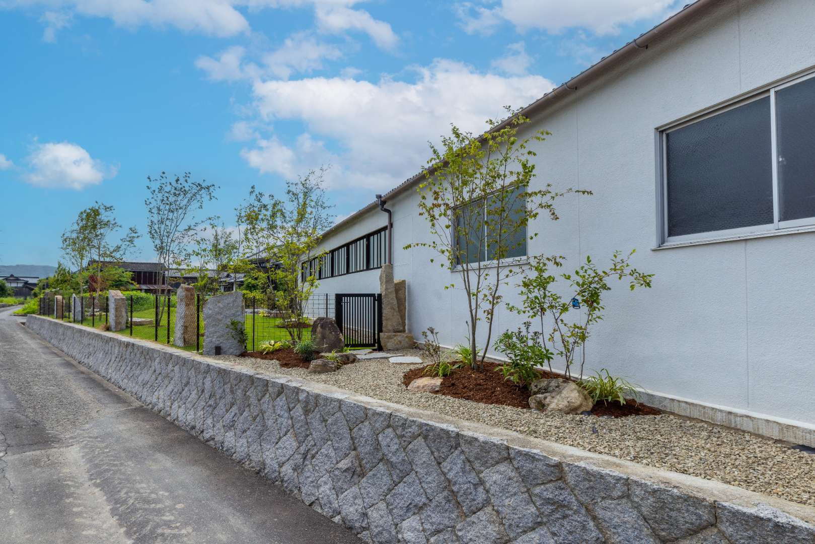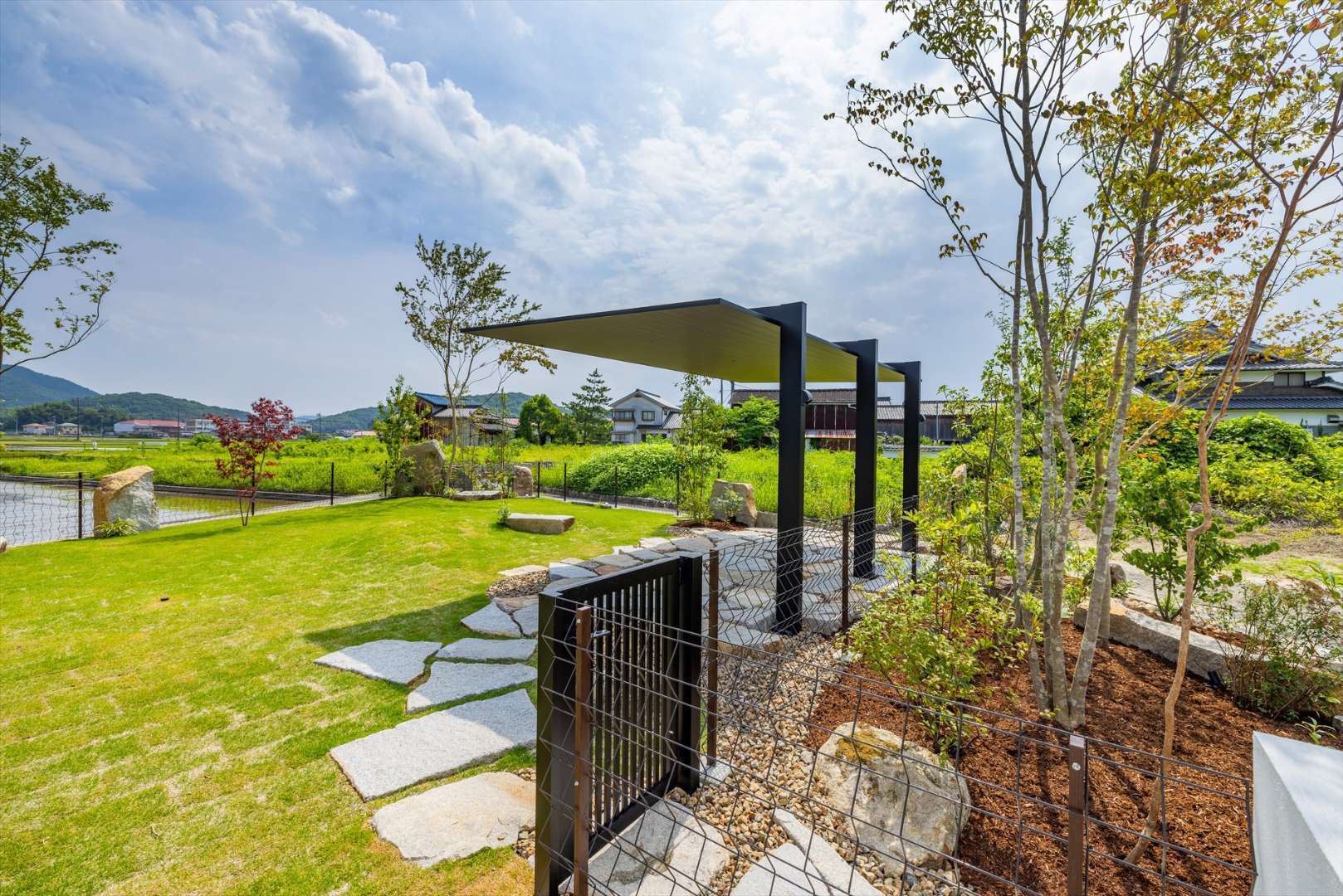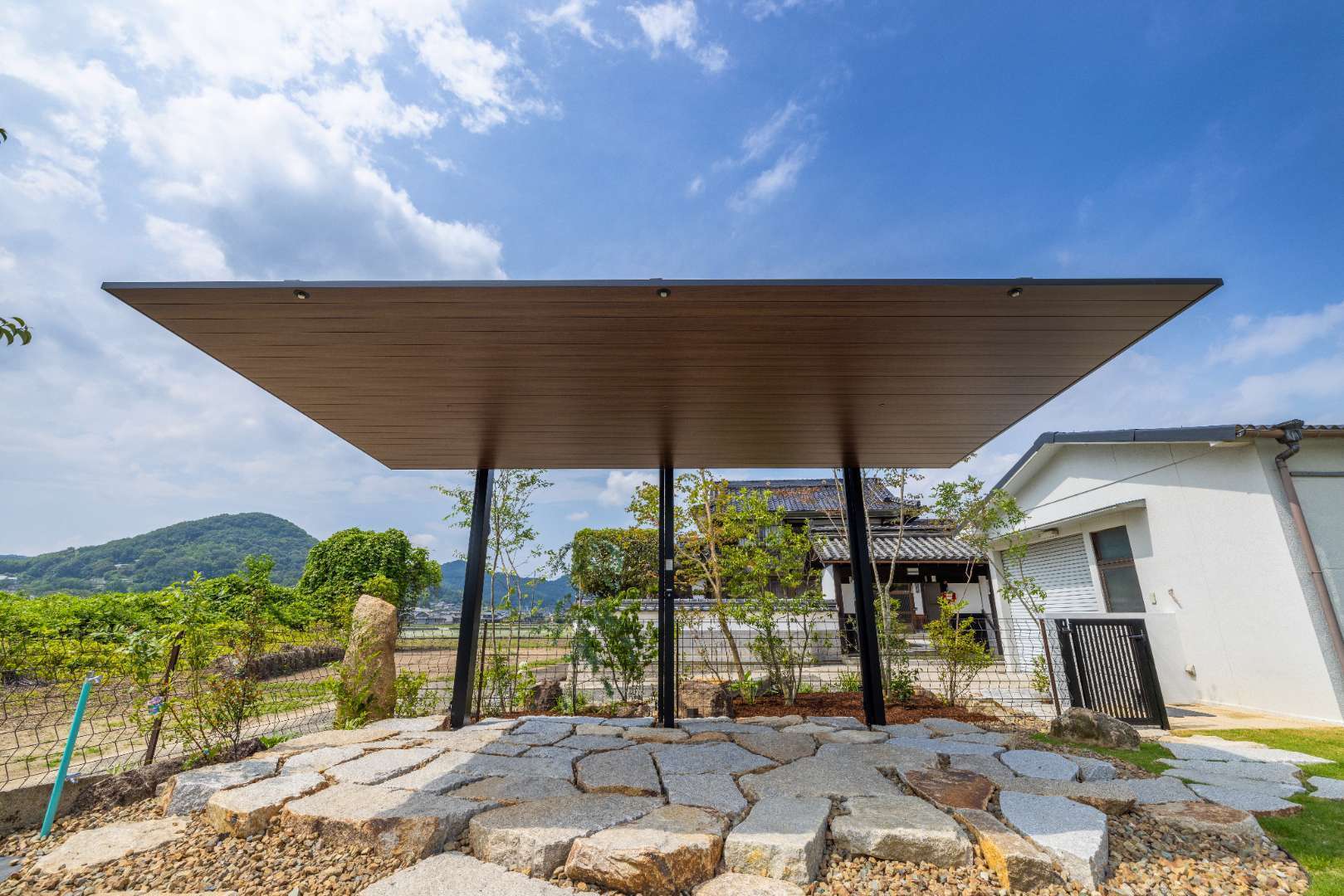 かつて畑として利用していた敷地をドッグランへと改修する事がご希望でした。ラン内に芝と植物と屋根付きテラスもご希望されており、照明も加えて昼夜問わず楽しめる空間デザインとしました。また、面積が広大なので周囲の風景を考慮して、地元の石材や敷地内の既存石も再利用し、SCカーポートの持つスタイリッシュな雰囲気と既存建物、地域の風景を融合させ、印象的なスペースとなる様に留意しました。