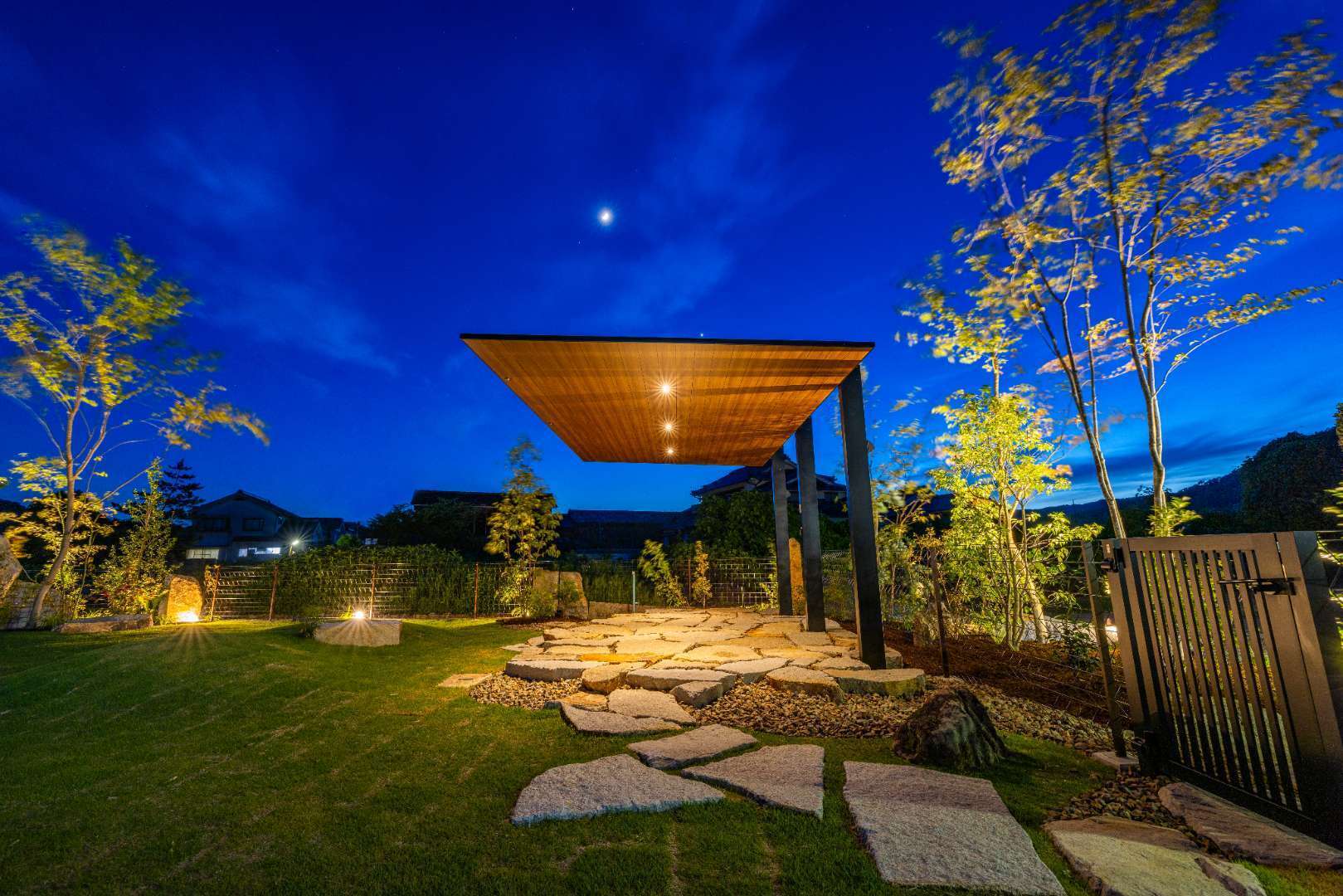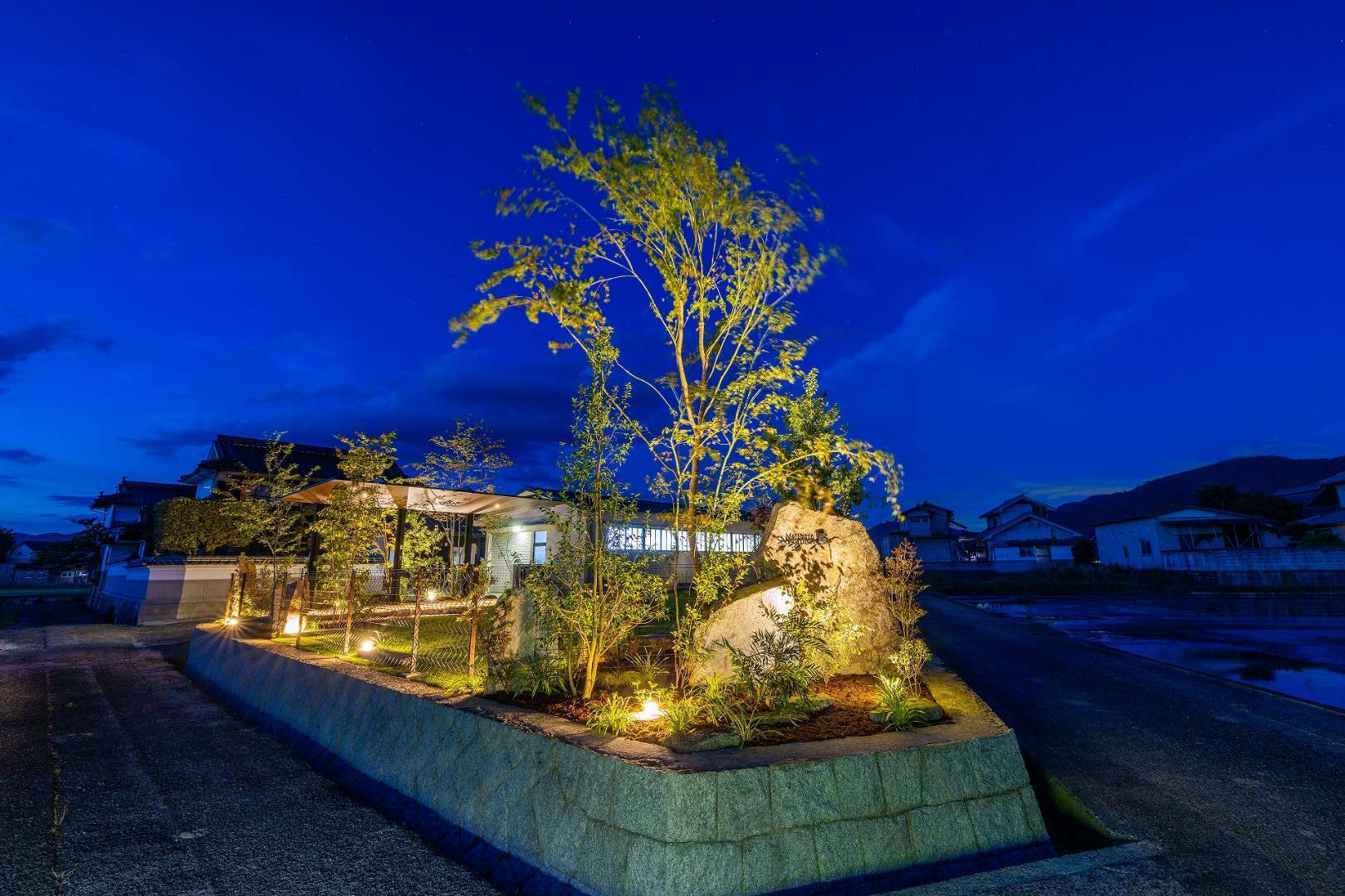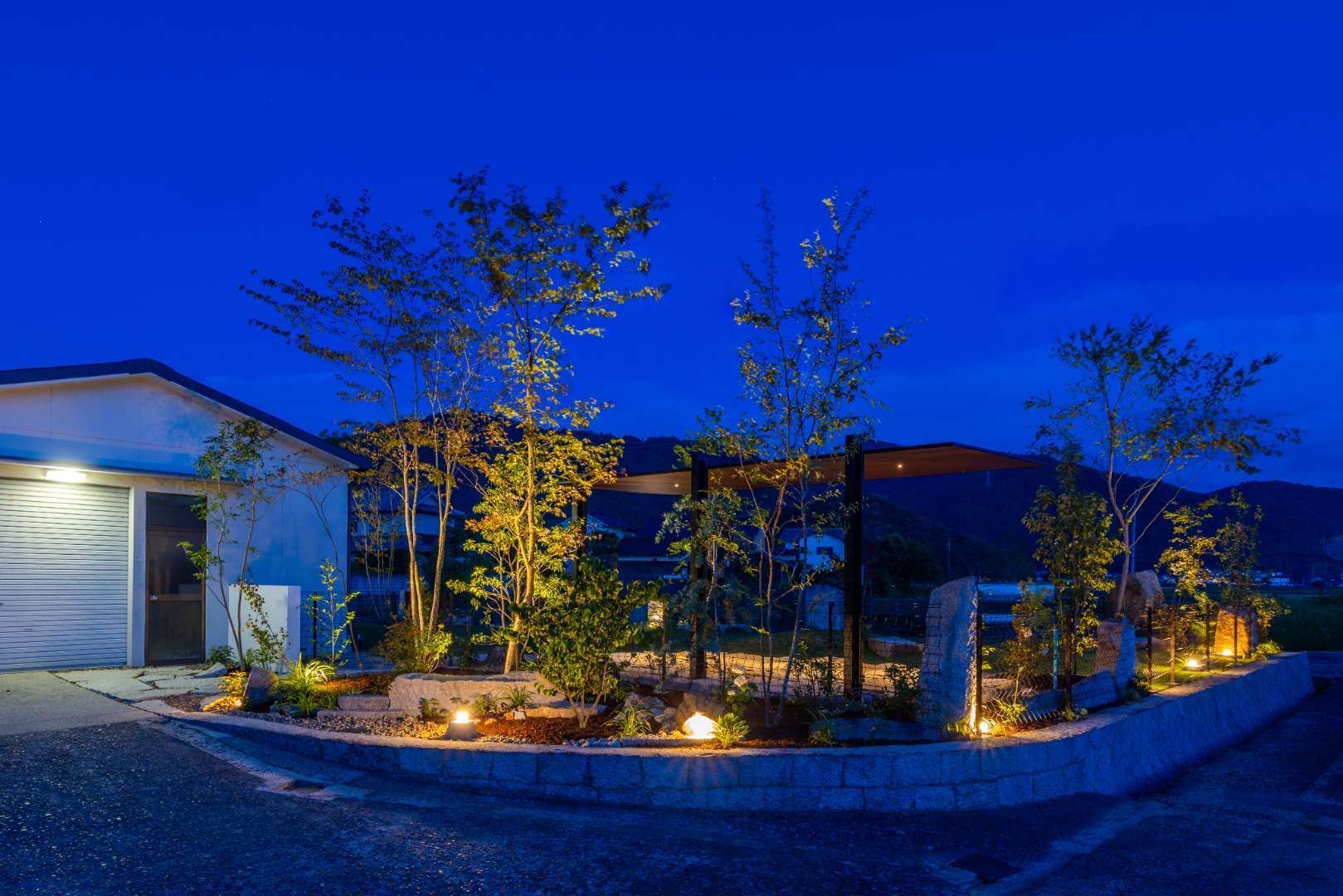 照明は敷地内の石や植栽を照らすだけでなく、街灯の少ない道路に夜の彩りを加える役目も果たしています。また、SCカーポートのダウンライト設置により、明るさだけなく、自然石テラスの陰影を美しく際立たせる結果となりました